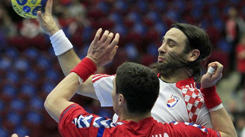 Hrvaški rokometaši tudi po velikem derbiju v četrtem kolu svetovnega prvenstva na Švedskem proti Srbom ostajajo neporaženi, čeprav so se spogledovali tudi s porazom. Srbi so namreč vodili s 23:21, na koncu pa so se "kavboji“ izvlekli in imeli v zadnjih sekundah prek Ivana Balića tudi strel za zmago, ki pa ni zadel cilja oziroma je bil na mestu vratar Cimosa Darko Stanić. Pri svetovnih podprvakih sta blestela Balić in Igor Vori, pri Srbih pa Marko Vujin in Ivan Nikčević. "Oni igrajo agresivno obrambo 6-0, zelo težko jo je prebiti, saj so v obrambi igrali zelo zgoščeno. Imeli smo težave v obrambi in napadu, tako da moramo biti s točko zadovoljni," je po obračun dejal Balić, ki je z nekaterimi potezami spomnil na svoje najboljše čase. Drug boj se je odvijal na tribunah. Poleg obveznega žvižganja ob igranju ene in druge himne je obračun minil v mirnem ozračju in brez večjih nemirov. V skupini C so tako po četrtem kolu brez izgubljene točke le še Danci. Tokrat so s 26:18 ugnali Alžirijo.