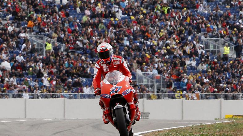 Z mislimi na Šojo Tomizavo, ki je preminul na prejšnji dirki, si je najboljši startni položaj za VN Aragonije v razredu MotoGP pridirkal Casey Stoner (Ducati). Iz prve vrste bosta 13. dirko sezone začela še Jorge Lorenzo (Fiat Yamaha), ki je ob vsakem poizkusu preveč izgubil v zadnjem sektorju steze (nastopa s čelado, kakšno je imel Tomizava), ter Dani Pedrosa (Repsol Honda), ki je naredil napako v zadnjem hitrem krogu (sicer bi bil morda prvi). Stoner je bil najhitrejši že na petkovem mokrem treningu, kot tudi na sobotnem jutranjem. Zmage v svoji zadnji sezoni pri rdečih si zelo želi.