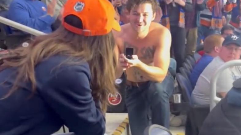 Nedavno smo poročali o neuspeli snubitvi na superpokalni tekmi Partizanom in Zenitom, tokratni prizori pa prihajajo iz ZDA, natančneje iz New Yorka, kjer sta se na tekmi hokejske lige NHL merili moštvi Florida Panthers in New York Islanders.