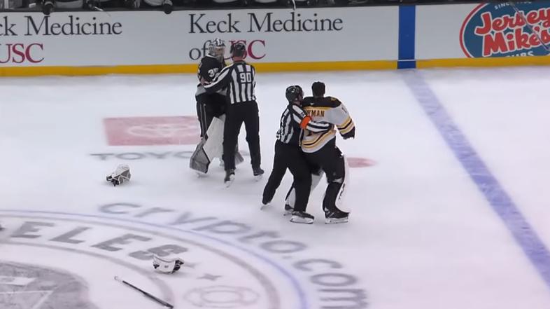 Darcy Kuemper and Jeremy Swayman leaver their crease, poised to drop the gloves.#GoKingsGo #NHLBruins #LAKvsBOS pic.twitter.com/RmWlFGj3T7