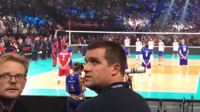 Peščica srbskih navijačev je poskrbela za incident v pariški dvorani, kjer je skoraj 13.000 Francozov prisostovalo presenetljivemu porazu domače reprezentance, ki se bo v tekmi za bron pomerila s Poljsko.