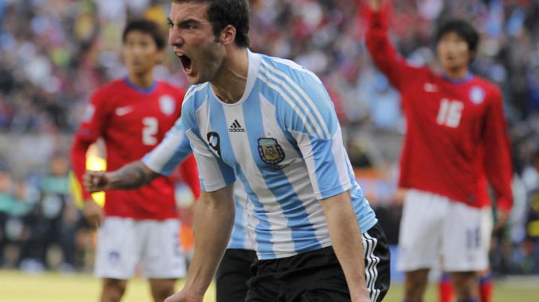 Nogometaši Argentine so v drugem krogu predtekmovalne skupine B na svetovnem prvenstvu v Južnoafriški republiki v Johannesburgu premagali Južno Korejo s 4:1 (2:1). Za Argentino je tri gole dosegel Gonzalo Higuain (33., 76. in 80.), enega je z avtogolom prispeval Park Chu-Young (17), za Južno Korejo pa je zadel Lee Chung-Yong (45).