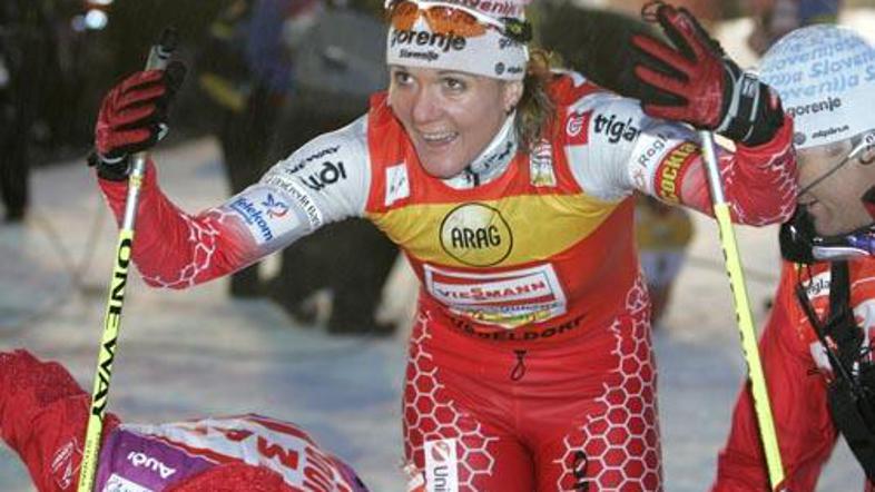 Naša najboljša smučarska tekačica Petra Majdič je v Düsseldorfu v sprintu v prosti tehniki ponovno premagala vso konkurenco in se veselila že tretje letošnje zmage v svetovnem pokalu.