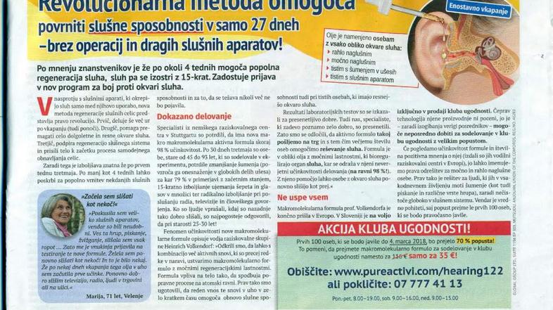 Iz UKC Ljubljana smo prejeli opozorilo glede zavajajočega oglasa za povrnitev slušne sposobnosti brez operacije ali slušnega aparata. Gre za tako imenovano makromonekularno formulo, ki se vklapa v ušesa in naj bi po štirih tednih sluh popolnoma povrnila.